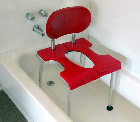 Our cushions are made from high-density memory foam dipped 6 times in a vinylized coating rendering them waterproof and extremely comfortable. They’re soft and “cushiony”, not like the hard plastic surfaces typically found on most commode shower chairs. The cushions are velcroed to the seat frame rendering them easily removed and reinstalled for cleaning and replacement.