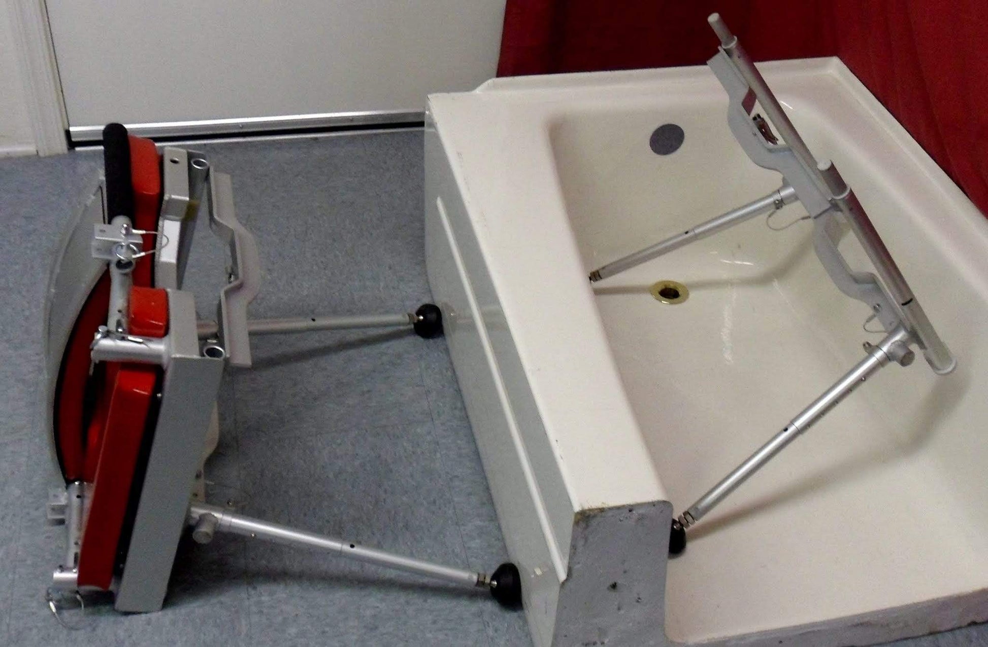 Although it was initially developed to meet the needs of the disabled traveler, this portable tub-slider is so comfortable that it is the ideal chair for everyday use at home, too. It has been designed to work in both left- and right-handed tubs. The seat height may be adjusted by shortening or extending the telescoping legs and the hourglass-shaped seat cushion allows for easy access beneath from either side.